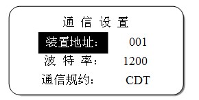 本菜單設(shè)置通信參數(shù),按上下方向鍵移動光標選擇需修改的參數(shù)項,按確認鍵進入修改狀態(tài),此時按方向鍵修改參數(shù),修改后按“確認”鍵保存,按“取消”鍵不做保存。