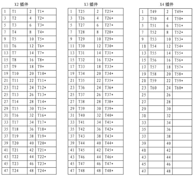 X5插件:端子1~8, Ⅰ~Ⅳ段母線零序電壓輸入;9~48,第1~20路CT出線。