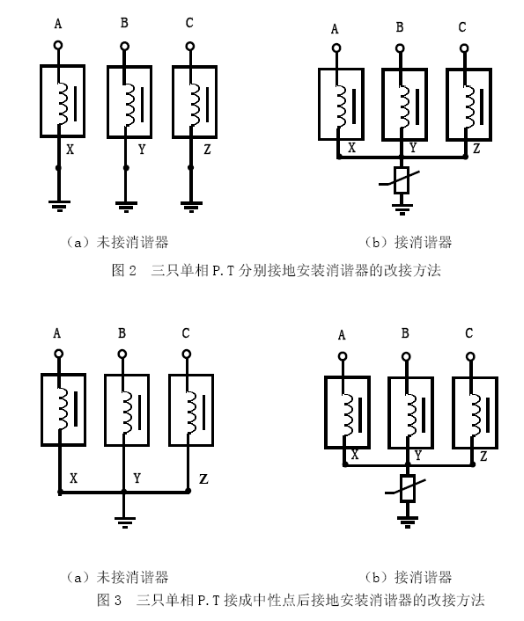WF-LXQ型、WF-LXQ(B)型一次消諧裝置,是安裝在6~35kV PT一次繞組Y0接線中性點與地之間的高容量非線性元件,起阻尼與限流的作用。該消諧裝置完全符合現(xiàn)行電力部標準DL/T 620— 1997《交流電氣裝置的過電壓保護和絕緣配合》第4.1.5 條中的規(guī)定,可以起到良好的限制電壓互感器鐵磁諧振的效果。