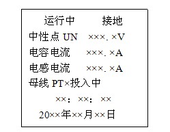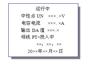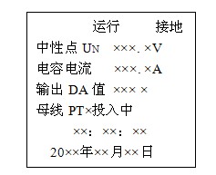 在監(jiān)測(cè)狀態(tài),屏幕顯示:中性點(diǎn)電壓值、檢出的電網(wǎng)電容電流值、目前直流勵(lì)磁情況(運(yùn)行人員不必注意)、當(dāng)兩段母線時(shí)正在使用的母線PT、當(dāng)前時(shí)間等。