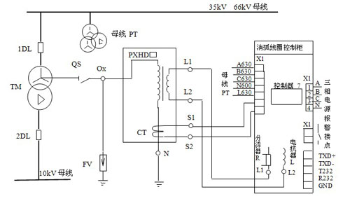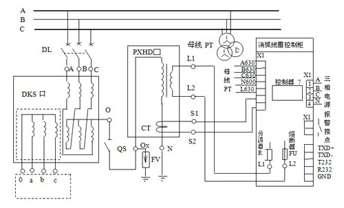 控制屏內(nèi)的分流器R外接消弧線圈本體的L1接線柱;對(duì)于6kV和10kV系統(tǒng),控制柜中熔斷器FU的空懸端接消弧線圈本體的L2接線柱,對(duì)于35kV和66kV系統(tǒng),控制柜中平波電抗器的空懸端接消弧線圈本體的L2接線柱,如5.2.1、5.2.2接線圖所示。