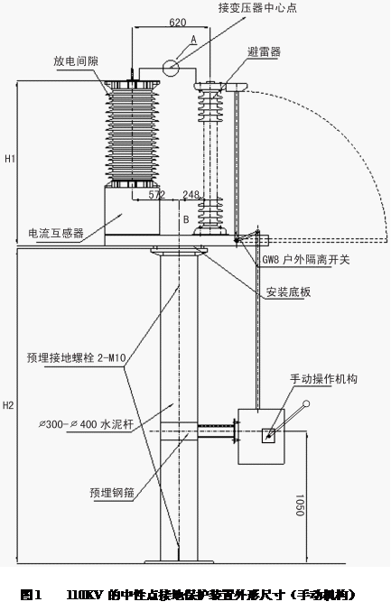 圖2 110KV的中性點(diǎn)接地保護(hù)裝置外形尺寸(電動(dòng)機(jī)構(gòu))